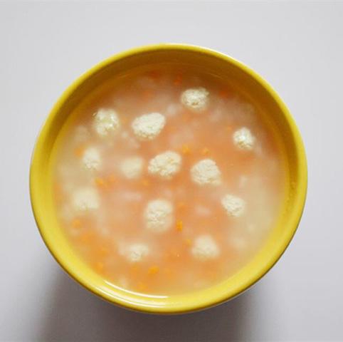 把胡萝卜泥混合到粥中去,再放入煮熟的鸡肉豆腐丸子即可。