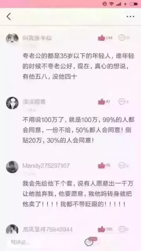 一网友在某论坛抛出了一个新奇的问题:给你1000万,你会卖掉你的老公吗? 底下的神回复真是绝了,让人忍俊不禁的同时不得不感叹:女同胞们怨气很重嘛~~